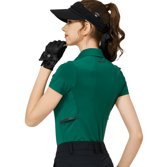 BLKTEE涼感冲孔透氣翻領女短袖上衣(墨綠)